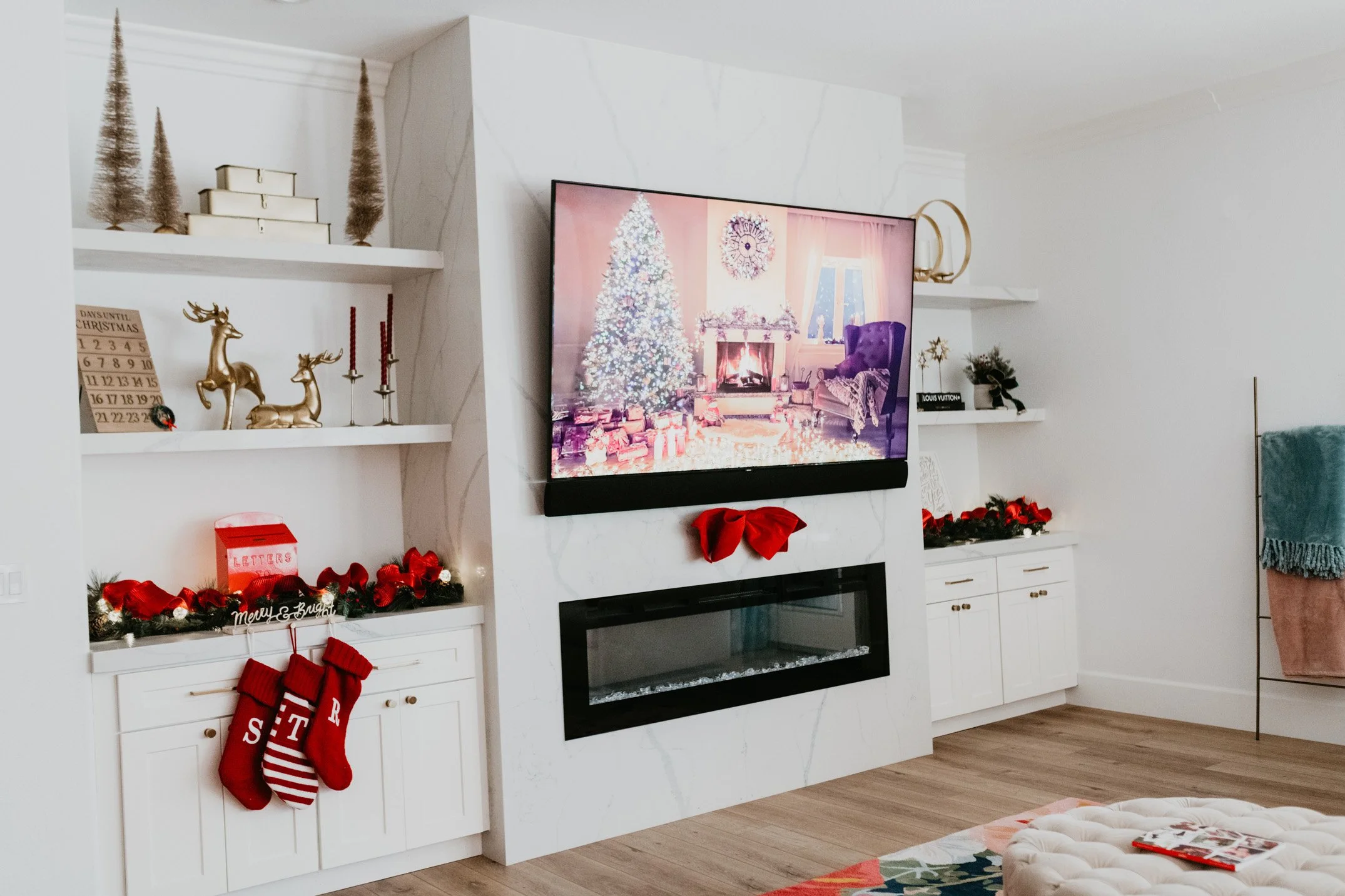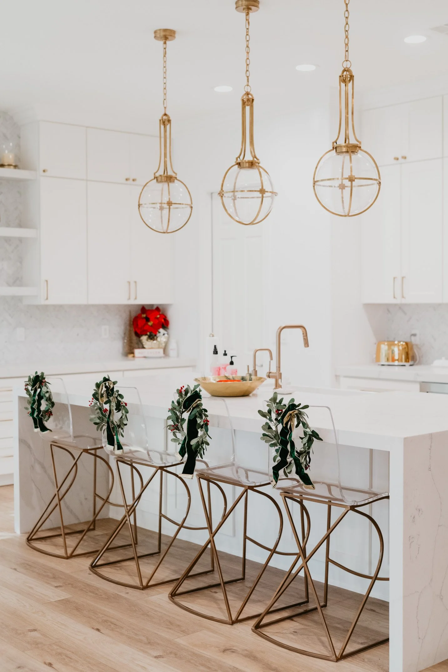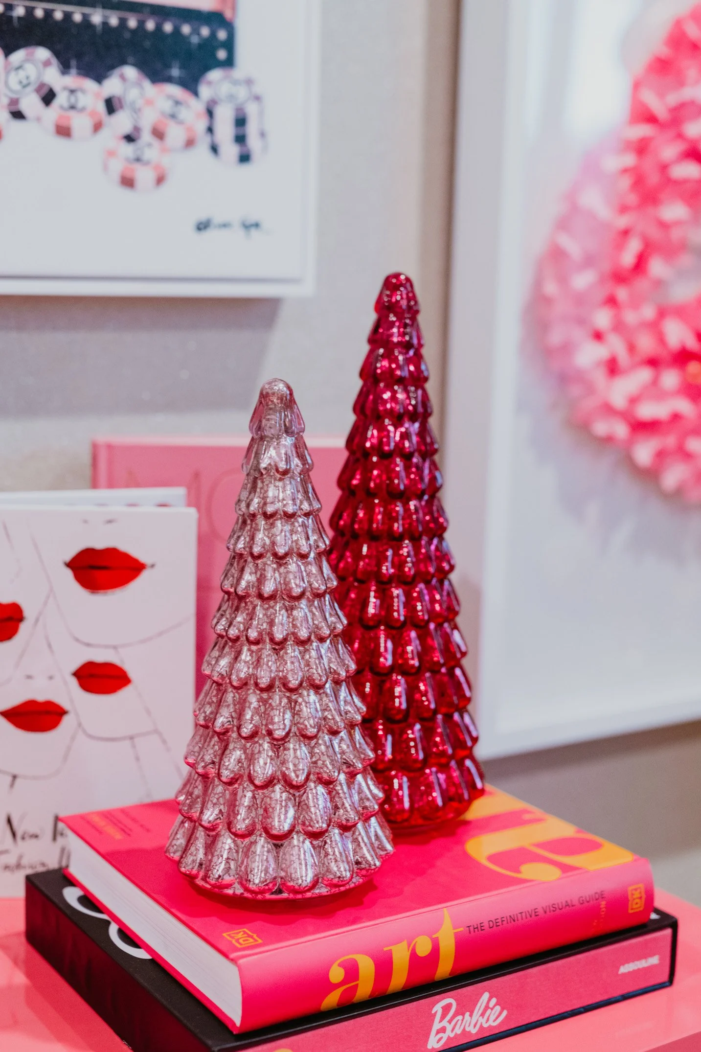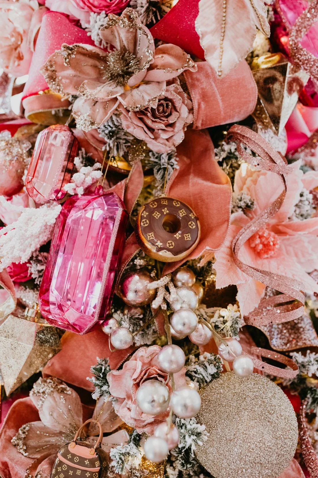 This year we did four trees. My main tree in the Great Room {9 ft}, my try-on nook tree {8 ft}, my office tree {7 ft}, and Taz’s cutest pencil tree in his room {7 ft}. Each tree has a different theme and design element, and it’s always so fun coming up with ideas with Amanda! The biggest tree is front and center in our living space, and it’s where we sit around and open presents on Christmas day. I like to keep this tree more “classic,” so it's red, green, and gold decor! It’s modern and stylish, with some whimsical elements. My favorite this year {and maybe ever!} is the tree in my try-on nook. Our theme was classy Barbie, so it had lots of pink, pearls, floral, and giant pink gemstones. I LOVED this tree. My office tree was Vegas themed, and super fun and colorful! And Taz’s sweet tree represented what he loves right now: Buzz Lightyear and Toy Story. The rest of our home we kept pretty traditional, all with glam elements.